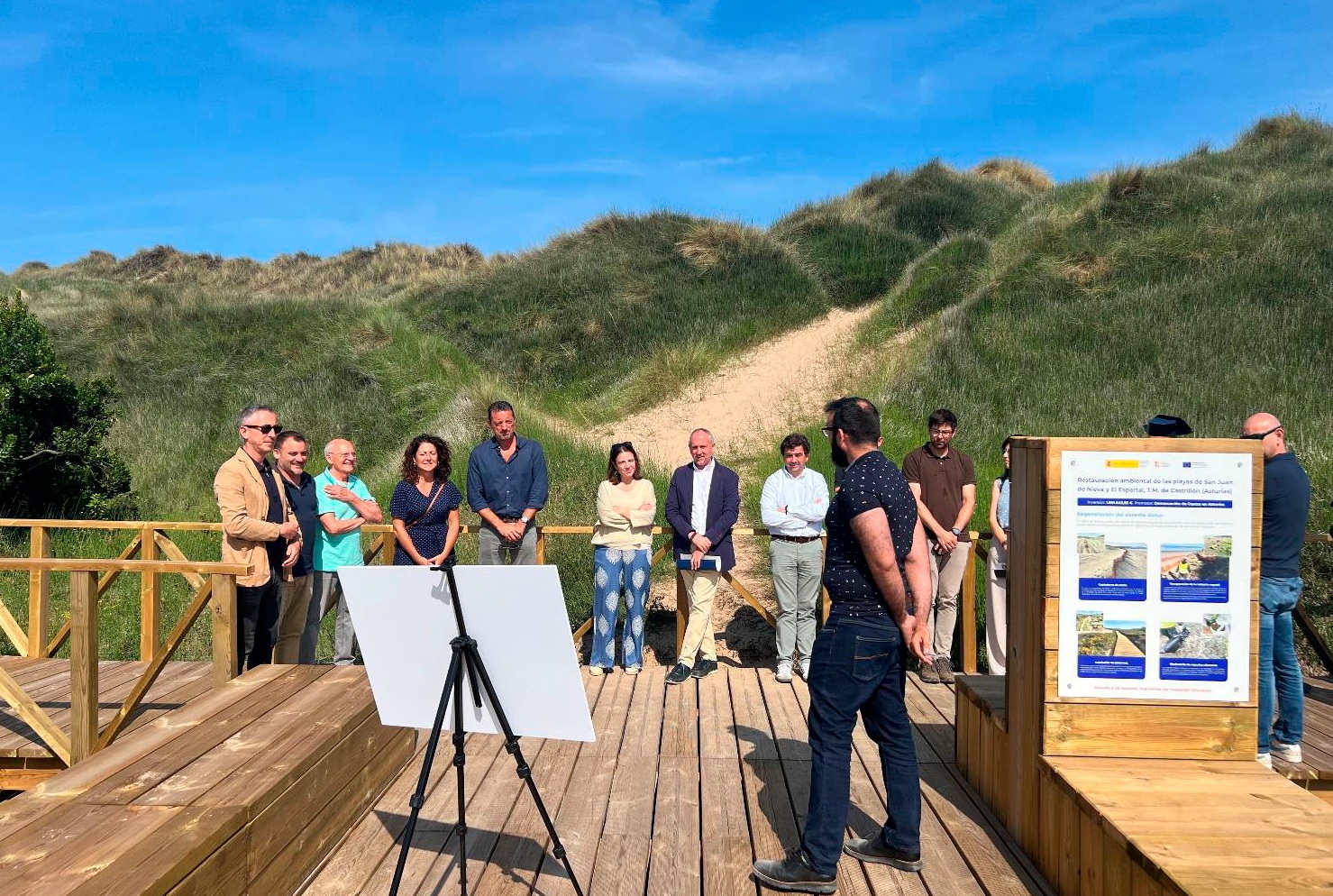 presupuesto de 52.000 euros, incluyó la reposición de las infraestructuras afectadas, la retirada de elementos dañados y la recuperación de arenas, garantizando la seguridad de vecinos y visitantes antes del inicio de la temporada estival. Asimismo, Lastra se desplazó hasta el concejo de Castrillón para comprobar el resultado de los trabajos de restauración ambiental desarrollados en el sistema dunar de las playas de San Juan de Nieva y El Espartal. Esta actuación, una de las más relevantes de los últimos años en la costa asturiana, ha supuesto una inversión de casi 2 millones de euros con cargo al Plan de Recuperación. Entre los trabajos ejecutados destacan la instalación de más de 2.500 metros lineales de captadores de arena, la plantación de más de 320.000 especies dunares autóctonas y la sustitución integral de la antigua pasarela de madera por una nueva infraestructura de más de 3.500 metros cuadrados, diseñada para minimizar el impacto sobre el ecosistema y ordenar el tránsito peatonal. Además, se han eliminado especies invasoras y se han instalado elementos de señalización y cartelería informativa para fomentar un uso responsable del espacio. La jornada finalizó con la visita a la Playa de San Pedro, en Cudillero, donde recientemente se ha llevado a cabo la sustitución del entarimado de madera que da acceso a la playa y a los servicios públicos. Esta actuación, con un presupuesto de 64.000 euros, ha sido considerada prioritaria ante el avanzado estado de deterioro del pavimento original, afectado por los temporales y el ambiente marino. El nuevo entarimado, fabricado con materiales resistentes y de integración paisajística, ha permitido recuperar la funcionalidad y seguridad de los accesos, garantizando una adecuada prestación de servicios durante la campaña estival. Estas actuaciones, enmarcadas en el plan de conservación y mantenimiento del litoral impulsado por el Ministerio para la Transición Ecológica y el Reto Demográfico, tienen como objetivo preservar y mejorar los valores ambientales, garantizar la seguridad ciudadana y asegurar un uso público ordenado y sostenible de los espacios costeros.