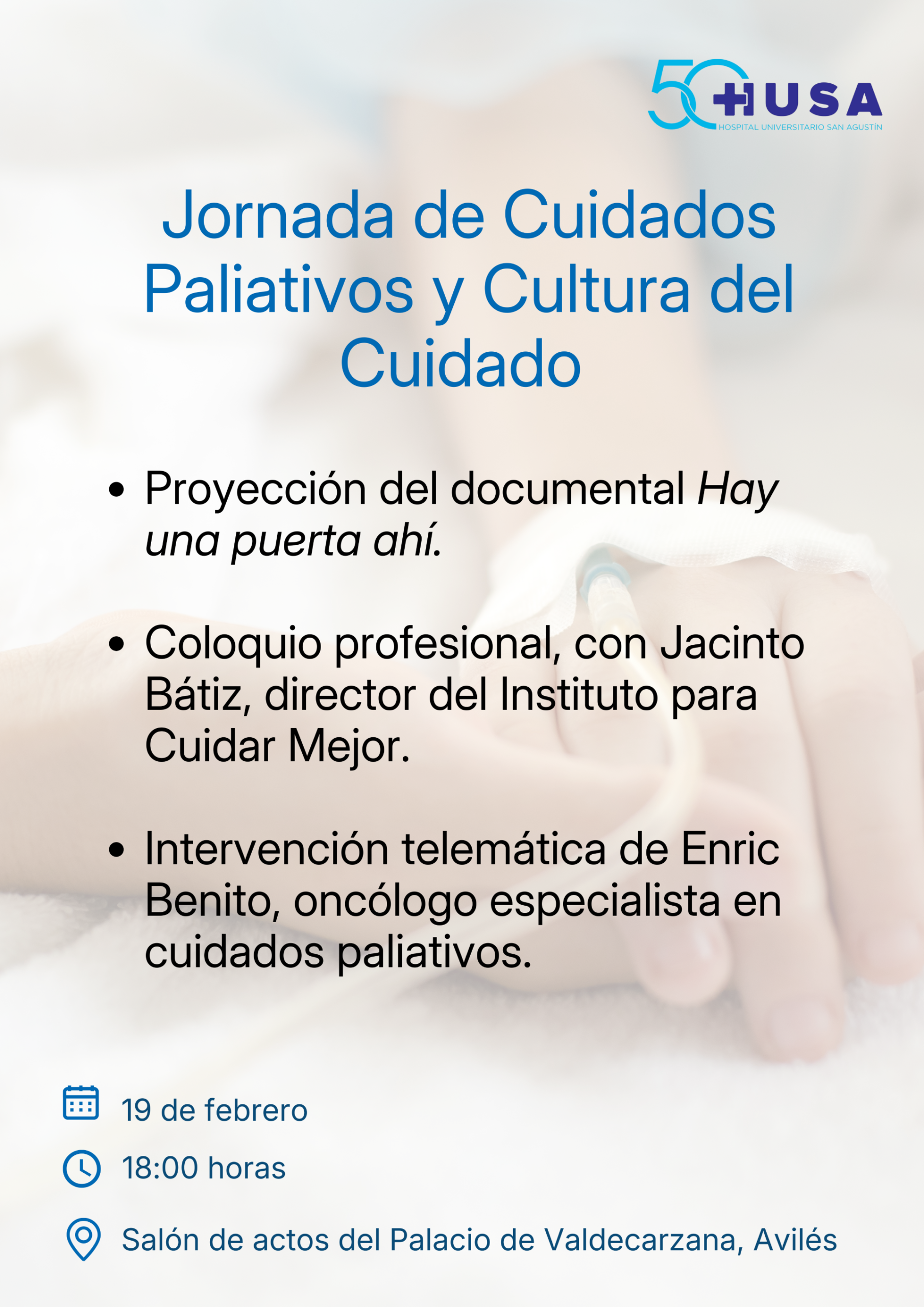 El programa incluye la proyección del documental Hay una puerta ahí, seguido de un coloquio con profesionales de referencia en cuidados paliativos y humanización de la atención sanitaria, entre los que figura el el doctor Jacinto Bátiz, director del Instituto para Cuidar Mejor. También intervendrá por vía telemática Enric Benito, oncólogo especialista en cuidados paliativos.